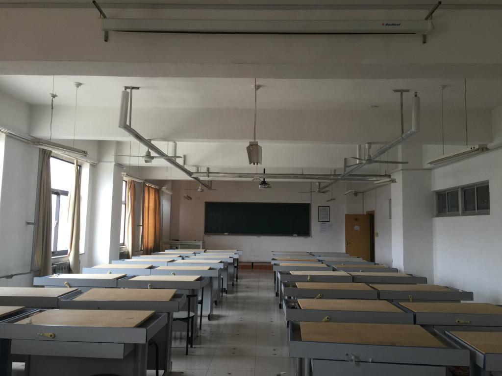 工程制图室位于六教404、405教室,两教室为打通教室,使用面积150平方米,可容纳71台学生制图桌,1台教师制图桌。同时制图室布置多媒体设备一台,文件柜4个。目前,工程制图室目前已投入仪器设备的购置经费20余万元。